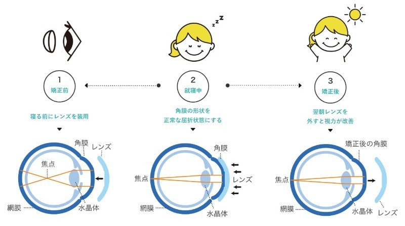 特殊な高酸素透過性ハードコンタクトレンズを夜間就寝時に装用し、角膜の形状を変化させることによって近視や乱視を矯正する治療です。日中は裸眼で生活することができます。
